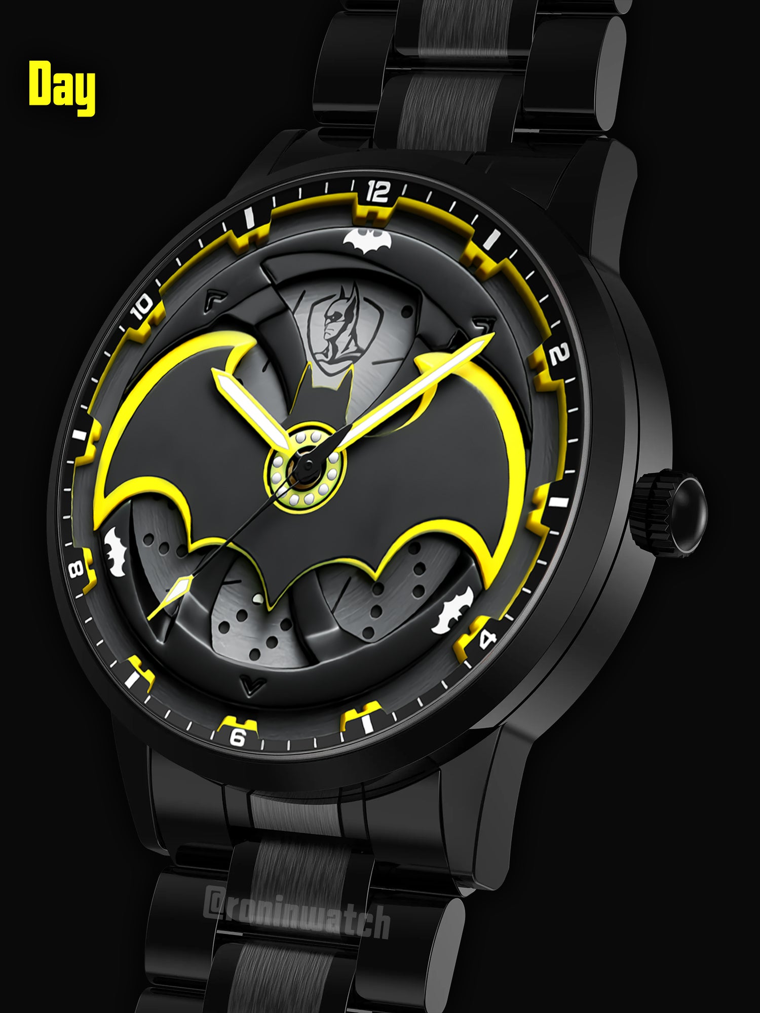 The definitive Bat-suit. Ronin presents a high-contrast classic, pairing jet black with the striking yellow of the legendary Bat-Signal. This timepiece channels the focused, unyielding resolve of the Dark Knight when he is most visible and most necessary. It is the core of the mythology, powerful, essential, and instantly recognizable. The spinning Bat-symbol at its center is the very signal cutting through the darkness, an undeniable marker of justice in motion. Unmistakable. Unyielding. This is the foundation of the legend.
