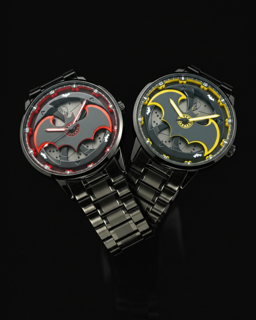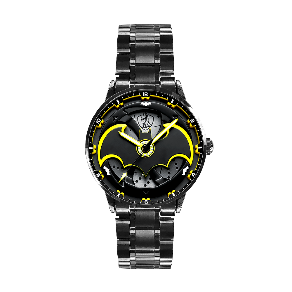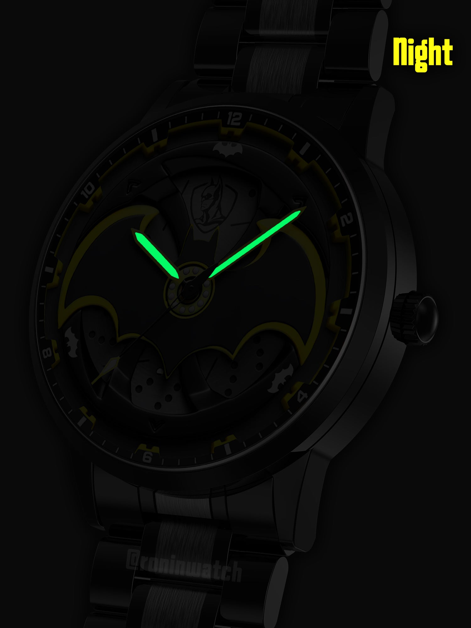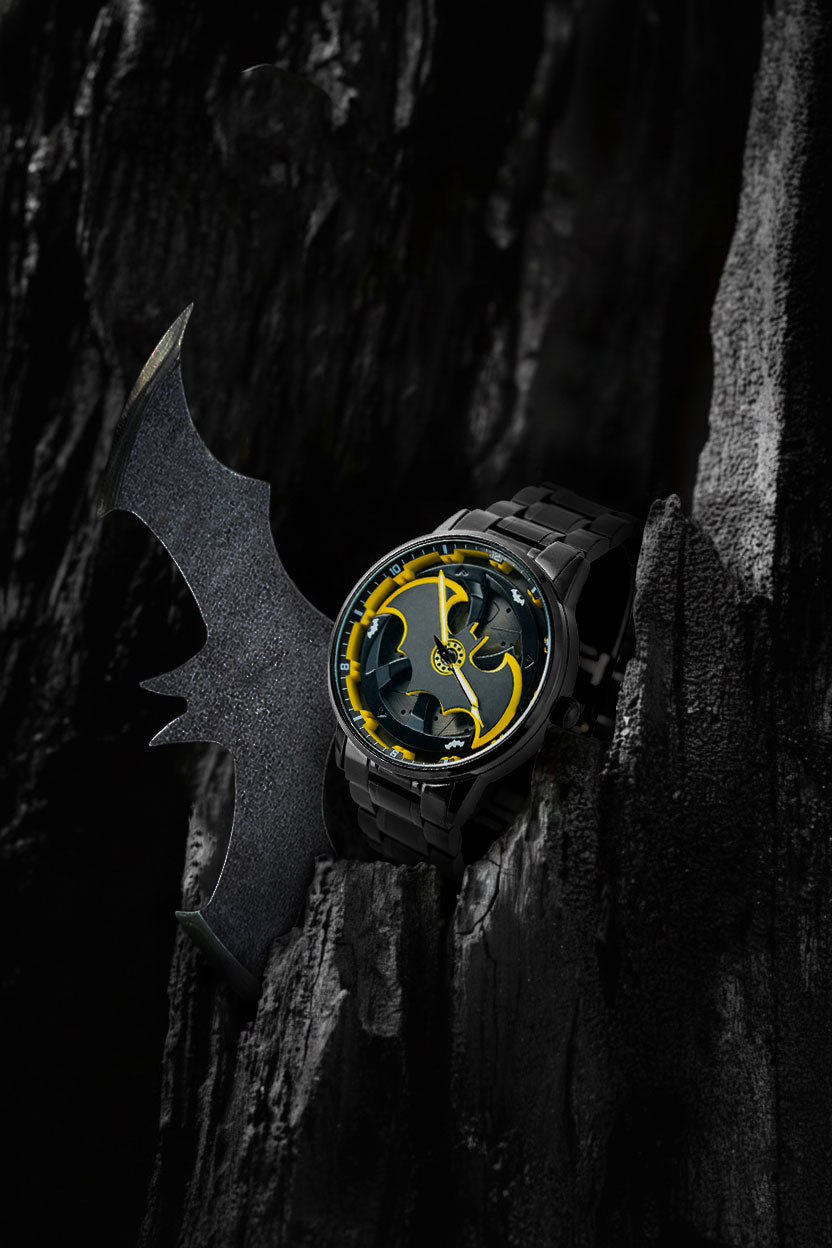 The definitive Bat-suit, reborn as a timepiece. Jet black meets the bold yellow of the Bat-Signal, capturing the Dark Knight’s strength and resolve. The spinning Bat-symbol slices through darkness, powerful, unmistakable, unyielding. This is the core of the legend.